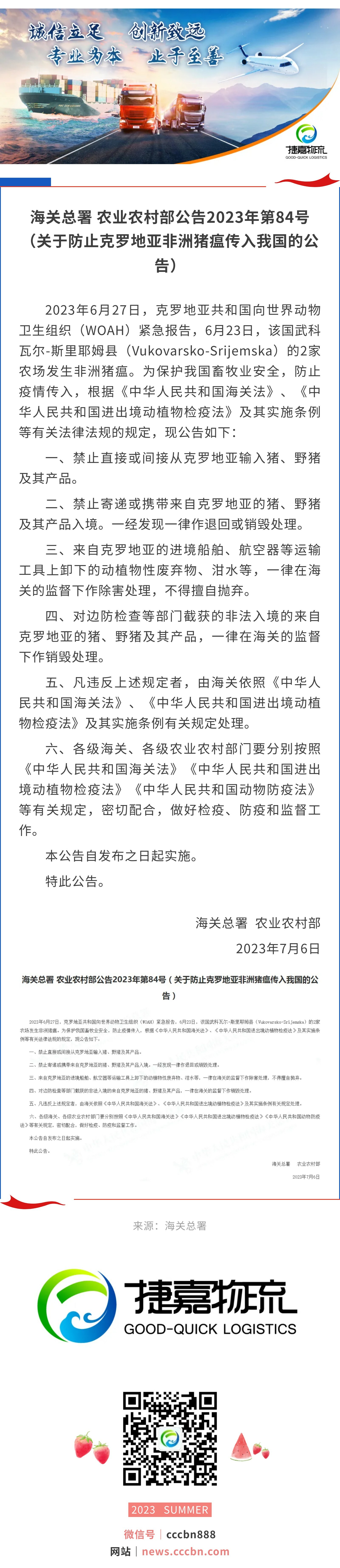 海关总署 | 关于防止克罗地亚非洲猪瘟传入我国的公告(海关总署 农业农村部公告2023年第84号)