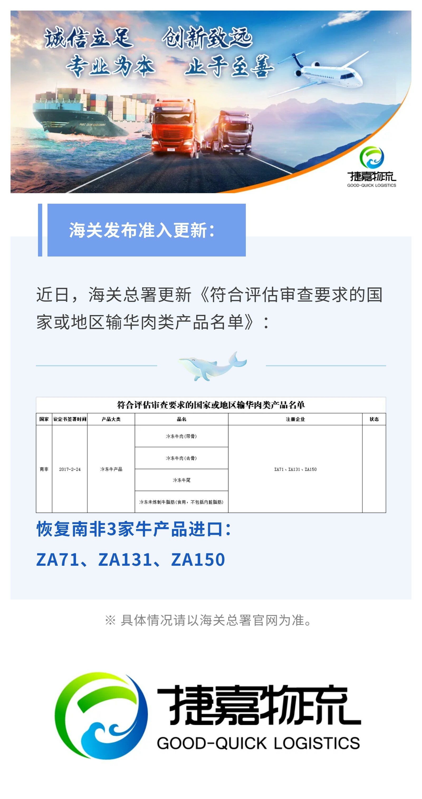 捷嘉 · 快讯 |【准入更新】恢复南非3家牛产品进口