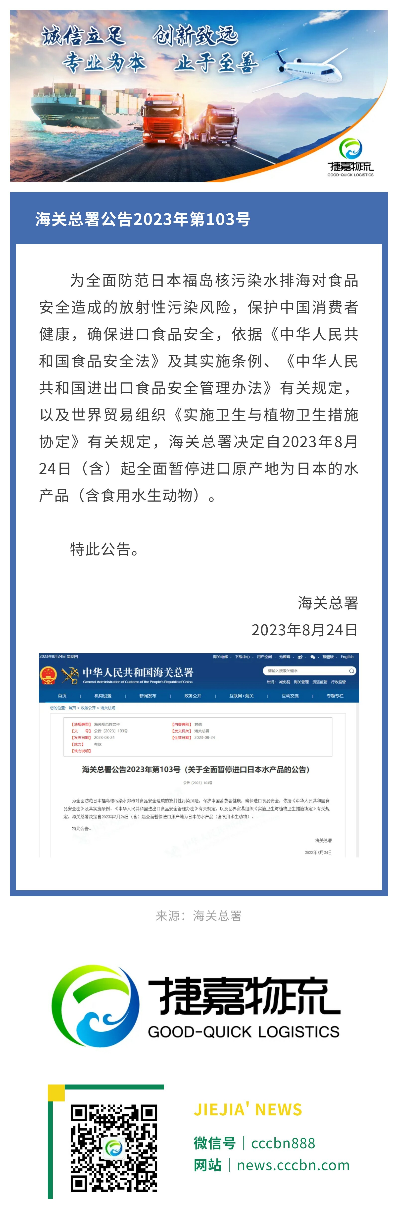 捷嘉关注 | 海关总署:关于全面暂停进口日本水产品的公告