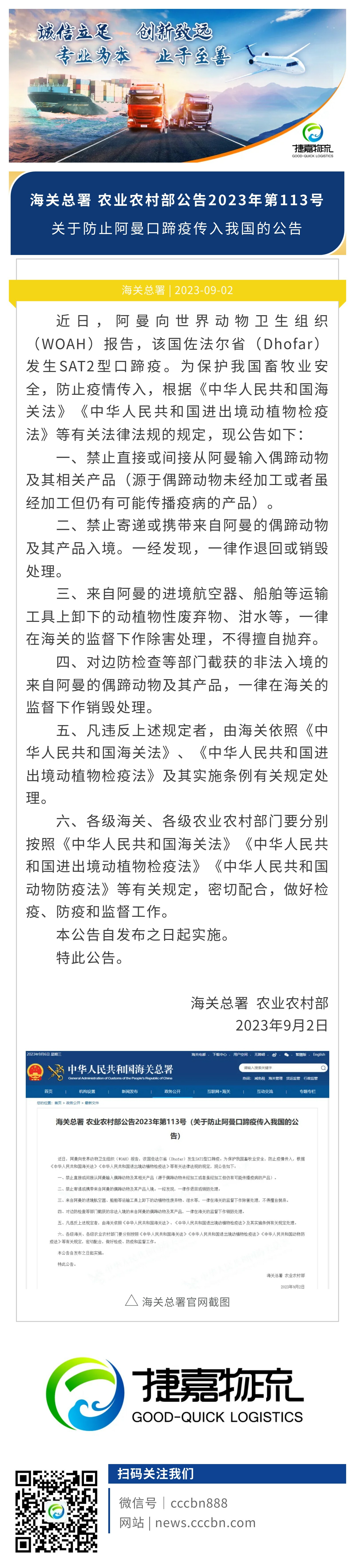 捷嘉关注 | 海关总署 农业农村部:关于防止阿曼口蹄疫传入我国的公告