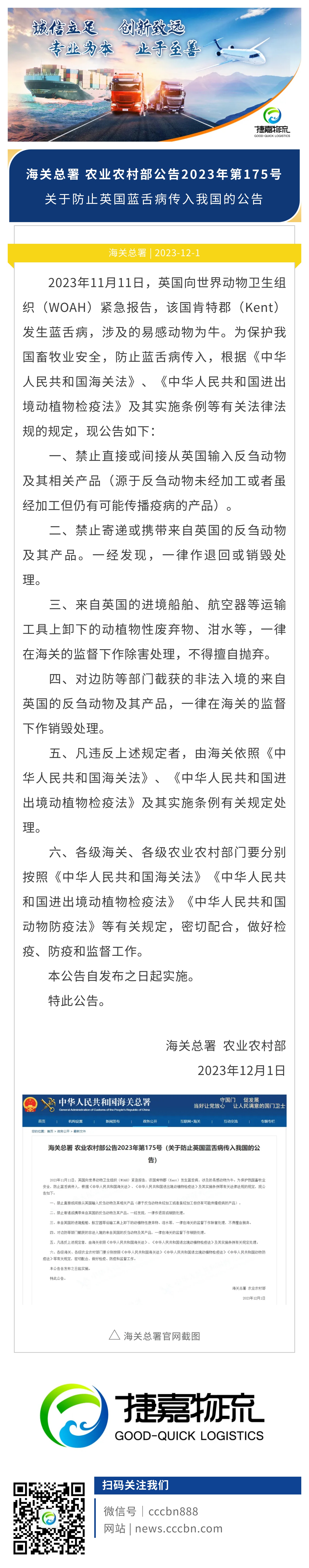 捷嘉 · 快讯 | 海关总署 农业农村部:关于防止英国蓝舌病传入我国的公告