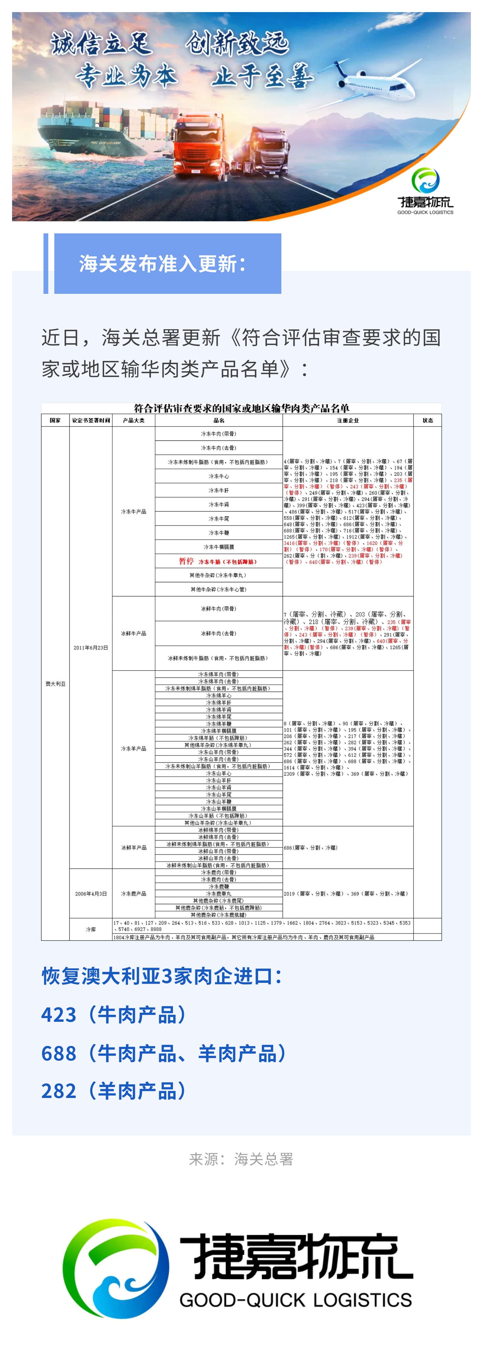 捷嘉 · 快讯 | 【准入更新】恢复澳大利亚3家肉企产品进口