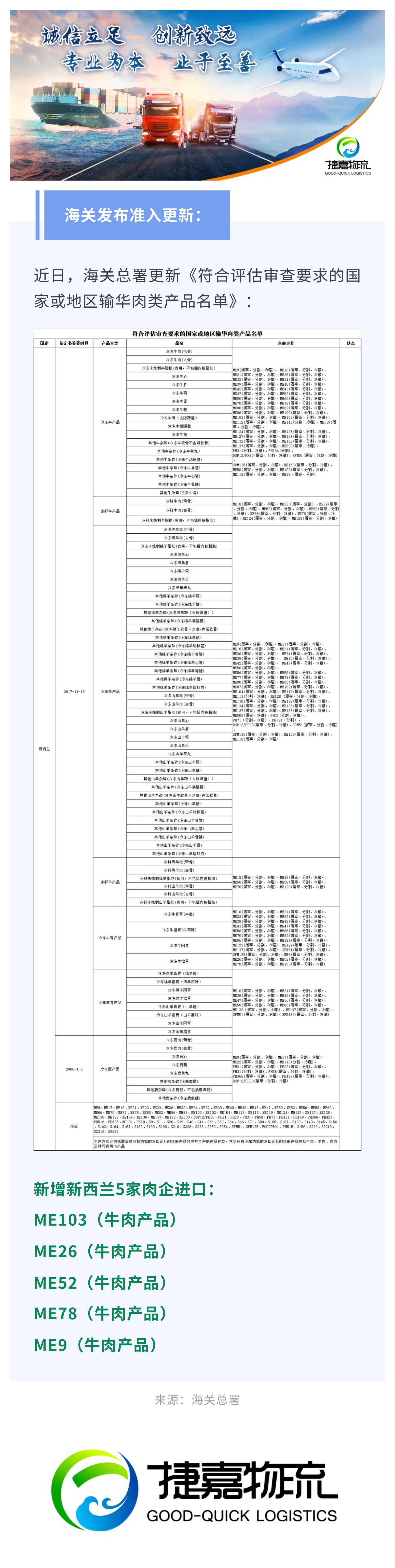 捷嘉 · 快讯 | 【准入更新】新增新西兰多家肉企产品进口