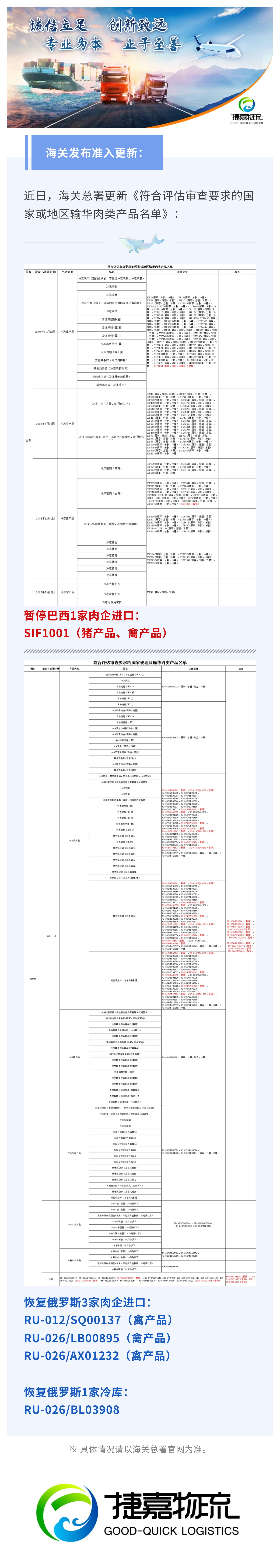 捷嘉 · 快讯 | 【准入更新】暂停巴西一家肉企产品输华;恢复俄罗斯多家肉企产品输华