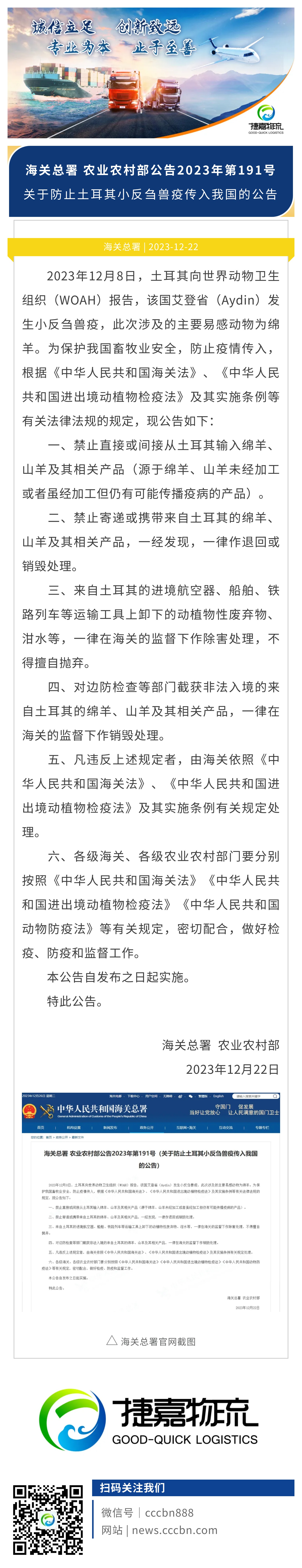 捷嘉 · 快讯 | 海关总署 农业农村部:关于防止土耳其小反刍兽疫传入我国的公告