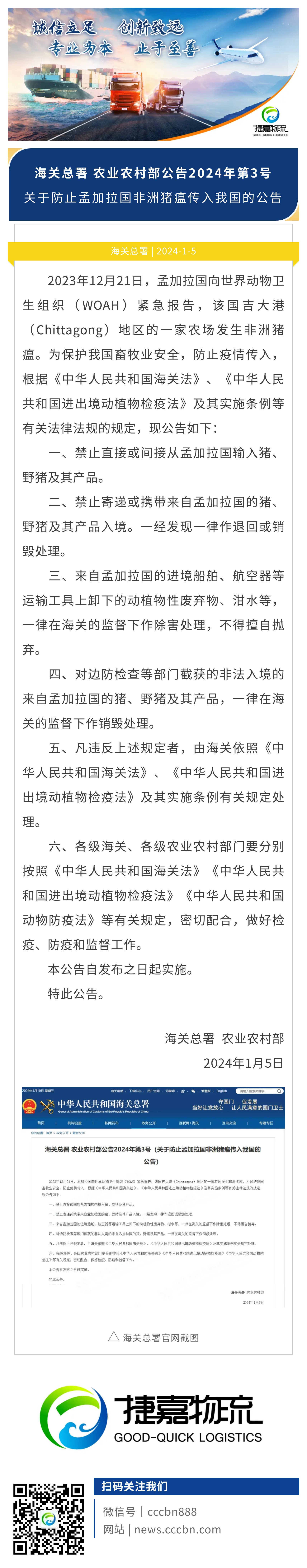 捷嘉 · 快讯 | 海关总署 农业农村部:关于防止孟加拉国非洲猪瘟传入我国的公告