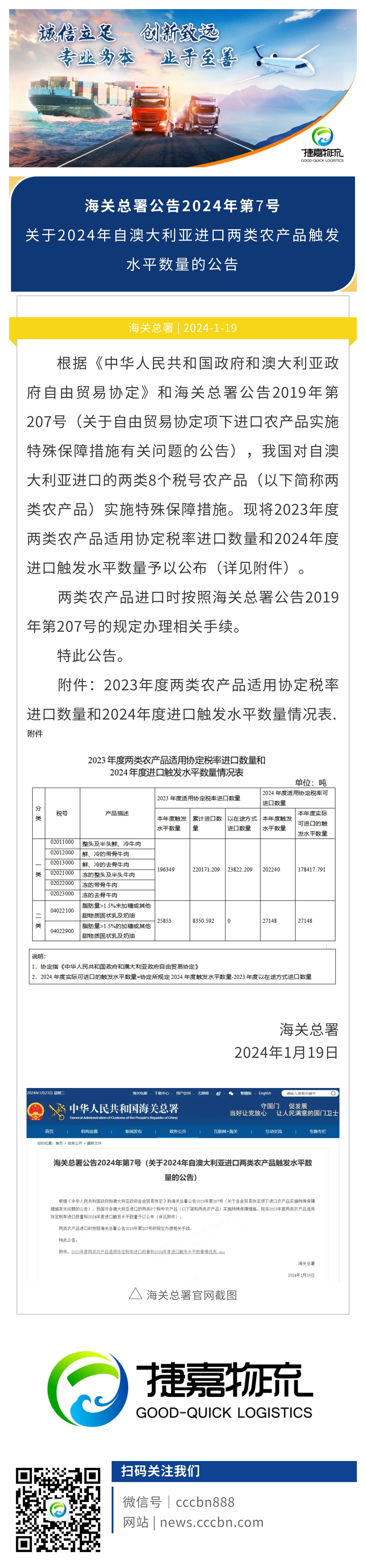捷嘉 · 快讯 | 海关总署:关于2024年自澳大利亚进口两类农产品触发水平数量的公告