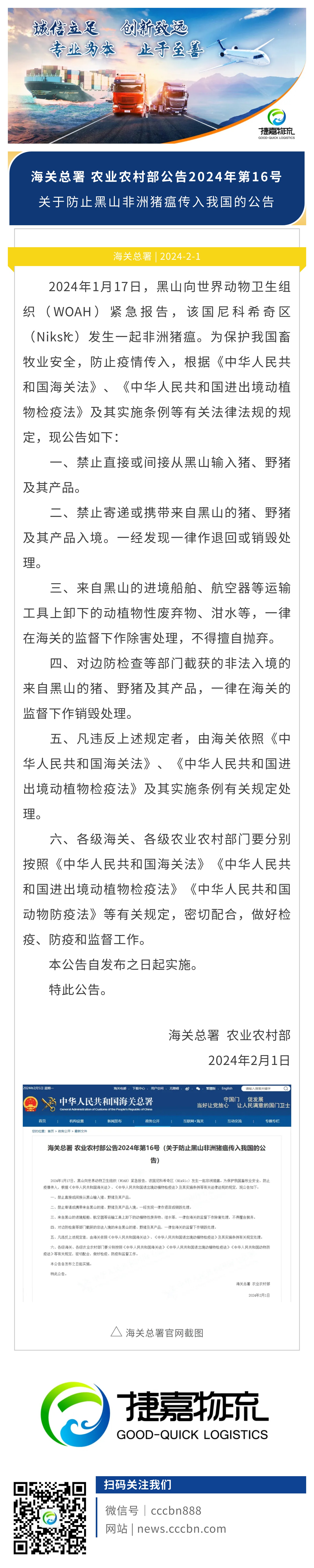 捷嘉 · 快讯 | 海关总署 农业农村部:关于防止黑山非洲猪瘟传入我国的公告