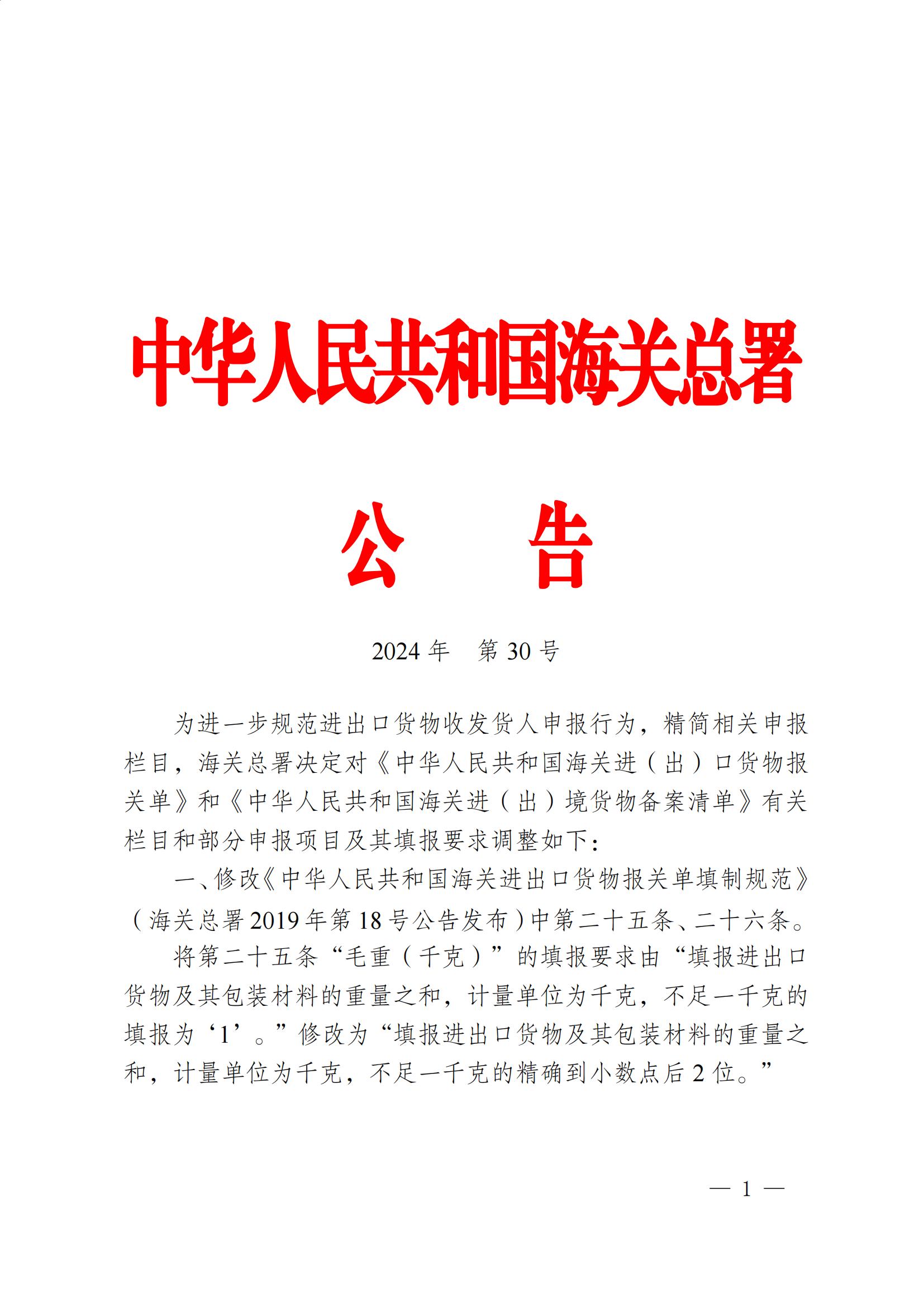 将第二十五条“毛重(千克)”的填报要求由“填报进出口货物及其包装材料的重量之和,计量单位为千克,不足一千克的填报为‘1’。”修改为“填报进出口货物及其包装材料的重量之和,计量单位为千克,不足一千克的精确到小数点后2位。”