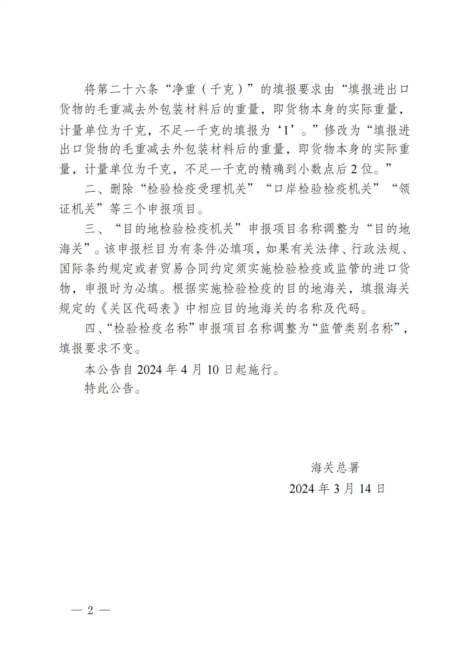 将第二十六条“净重(千克)”的填报要求由“填报进出口货物的毛重减去外包装材料后的重量,即货物本身的实际重量,计量单位为千克,不足一千克的填报为‘1’。”修改为“填报进出口货物的毛重减去外包装材料后的重量,即货物本身的实际重量,计量单位为千克,不足一千克的精确到小数点后2位。”