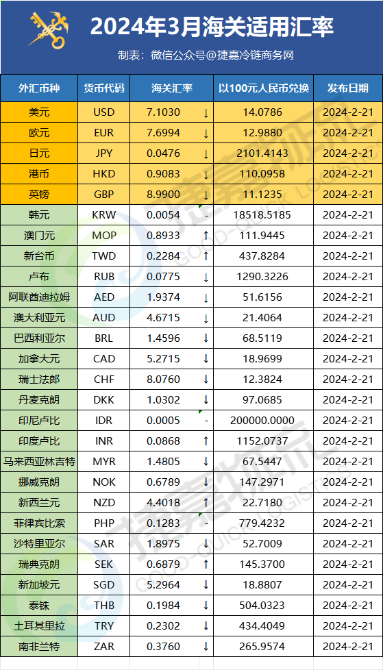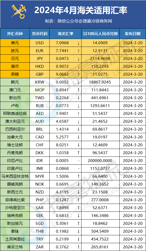 2024年3月海关汇率(对比)