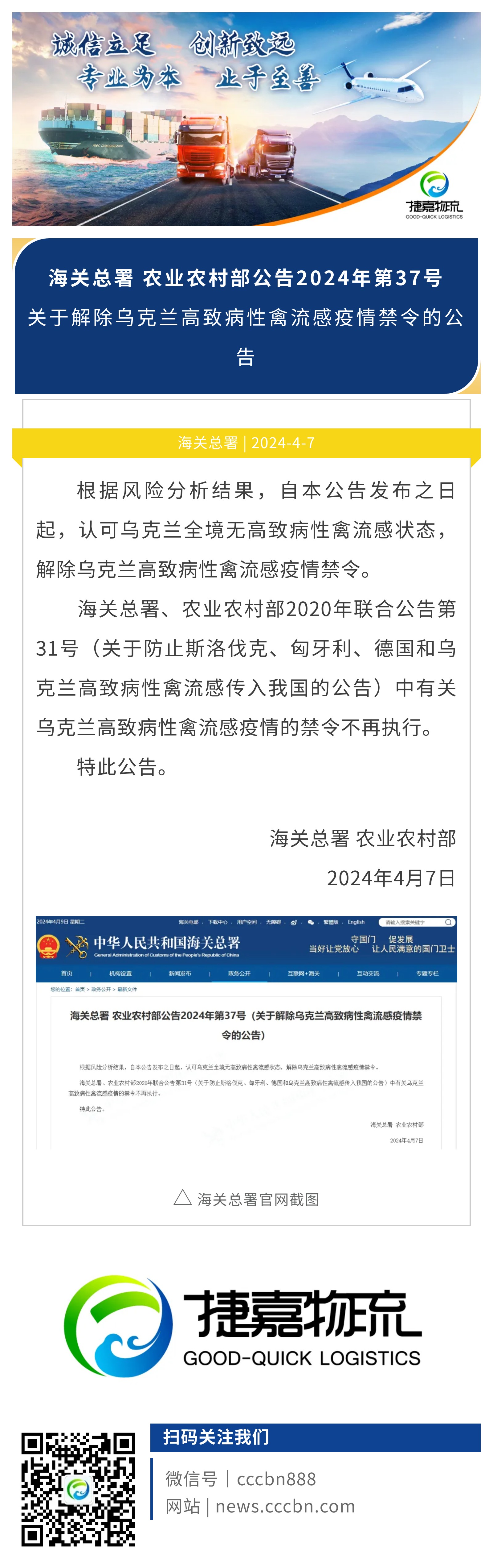 捷嘉 · 关注 | 海关总署 农业农村部:关于解除乌克兰高致病性禽流感疫情禁令的公告