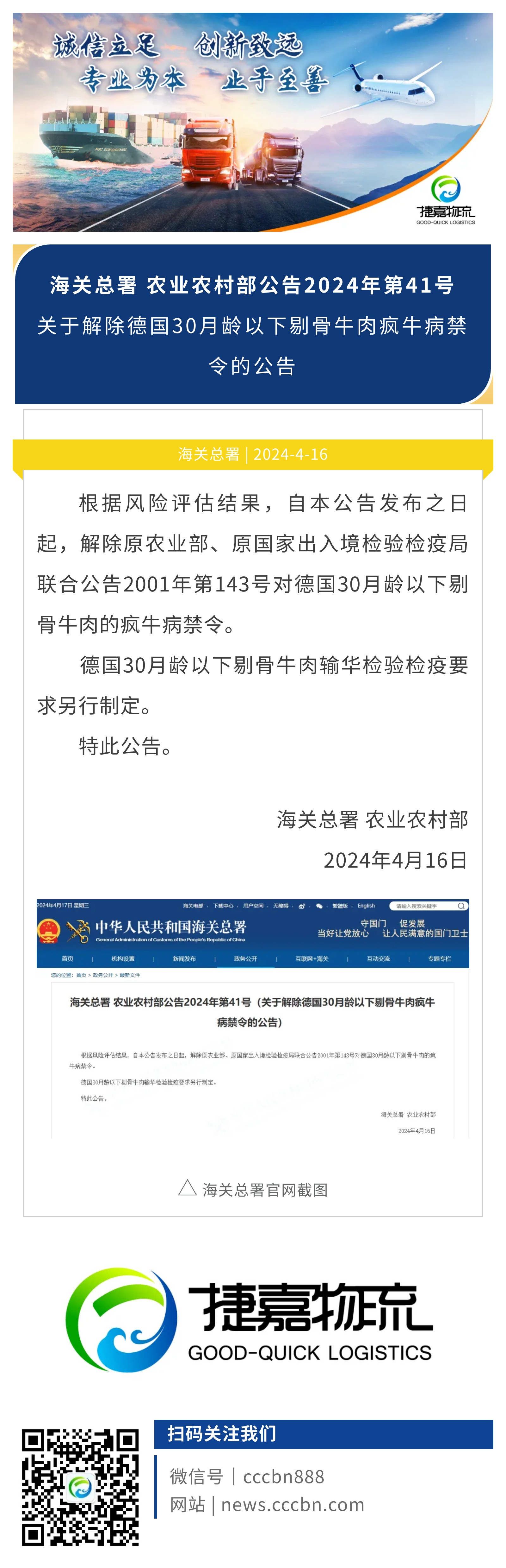 捷嘉 · 关注 | 海关总署 农业农村部:关于解除德国30月龄以下剔骨牛肉疯牛病禁令的公告