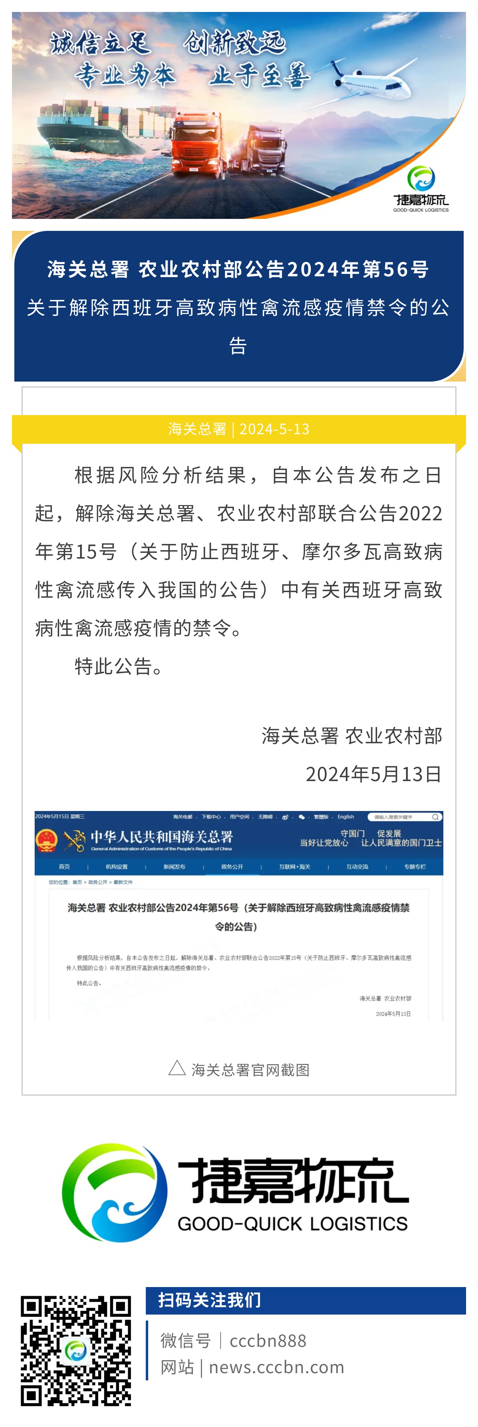 捷嘉 · 关注 | 海关总署 农业农村部:关于解除西班牙高致病性禽流感疫情禁令的公告
