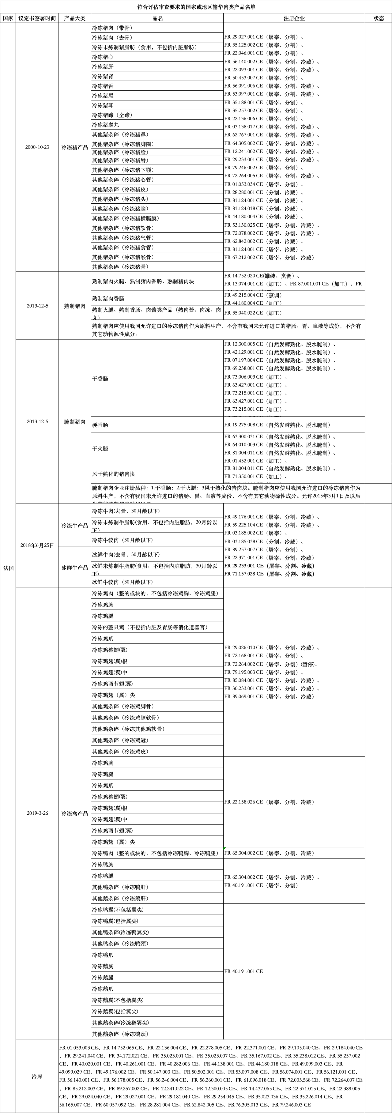 近日,海关总署更新《符合评估审查要求的国家或地区输华肉类产品名单》: