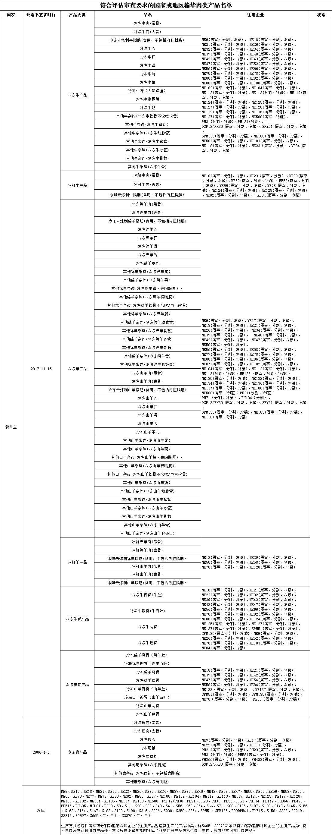 新增新西兰2家(只有冷藏功能的冷库企业其注册产品为牛肉、羊肉及其可食用肉产品)冷库:
