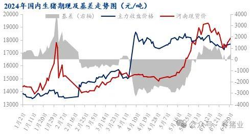 截至6月30日,2024年上半年生猪期货主力合约最低点2月19日13365元/吨,最高点6月3日18700元/吨,半年轮换2403、2405、2407、2409四个期货合约。二季度,现货价格较一季度有明显拉涨,盘面则交易后续抛压释放风险,同时,产业套保盘持续压制上方空间,使其在17500-18700元/吨区间宽幅震荡,迟迟未突破前高。随着现货的快速拉涨,基差由负转正。2024年上半年生猪期现及基差走势图如上所示,基差最高点为1月31日3875元/吨,最低点为4月9日-3295元/吨,由于生猪期货换月相对频繁,不同月份价差较大,故基差波动幅度较大。