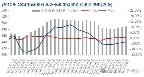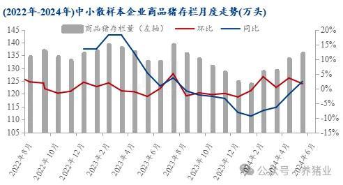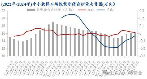 进入6月规模场商品猪存栏量为3384.09万头,环比上涨0.41%,同比减少0.41%。85家中小散样本企业6月份存栏量为135.71万头,环比上涨1.59%,同比上涨2.35%。2023年7月仍有惯性投苗补栏,对应2024年6月生猪供给增加,且5月份看涨预期下,养殖端有压栏操作,出栏节奏减缓,亦不乏散养户二育及仔猪和母猪投苗,故商品猪存栏量环比增量。随着一季度仔猪及其母猪的补栏产能兑现,预计三四季度商品猪存栏量是微增趋势。