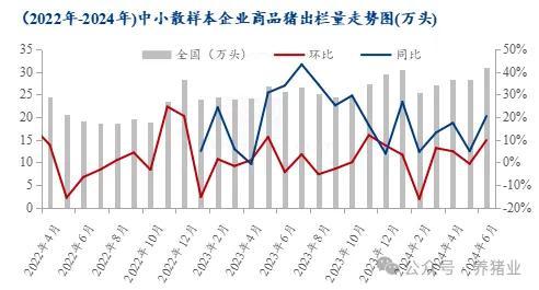 2024年上半年商品猪出栏量变化较明显,1-2月份因去年12月养殖企业年底集中出栏,出栏量较高,而造成1-2月份出栏量较少。3-4月份出栏量较为平均,5月份因前期压栏猪源及部分二次育肥猪源出栏,增量明显。6月份规模样本企业出栏进度不快,部分未完成,环比减少7.65%。散户样本企业价格下行态势下加大出栏量,环比增加9.76%。