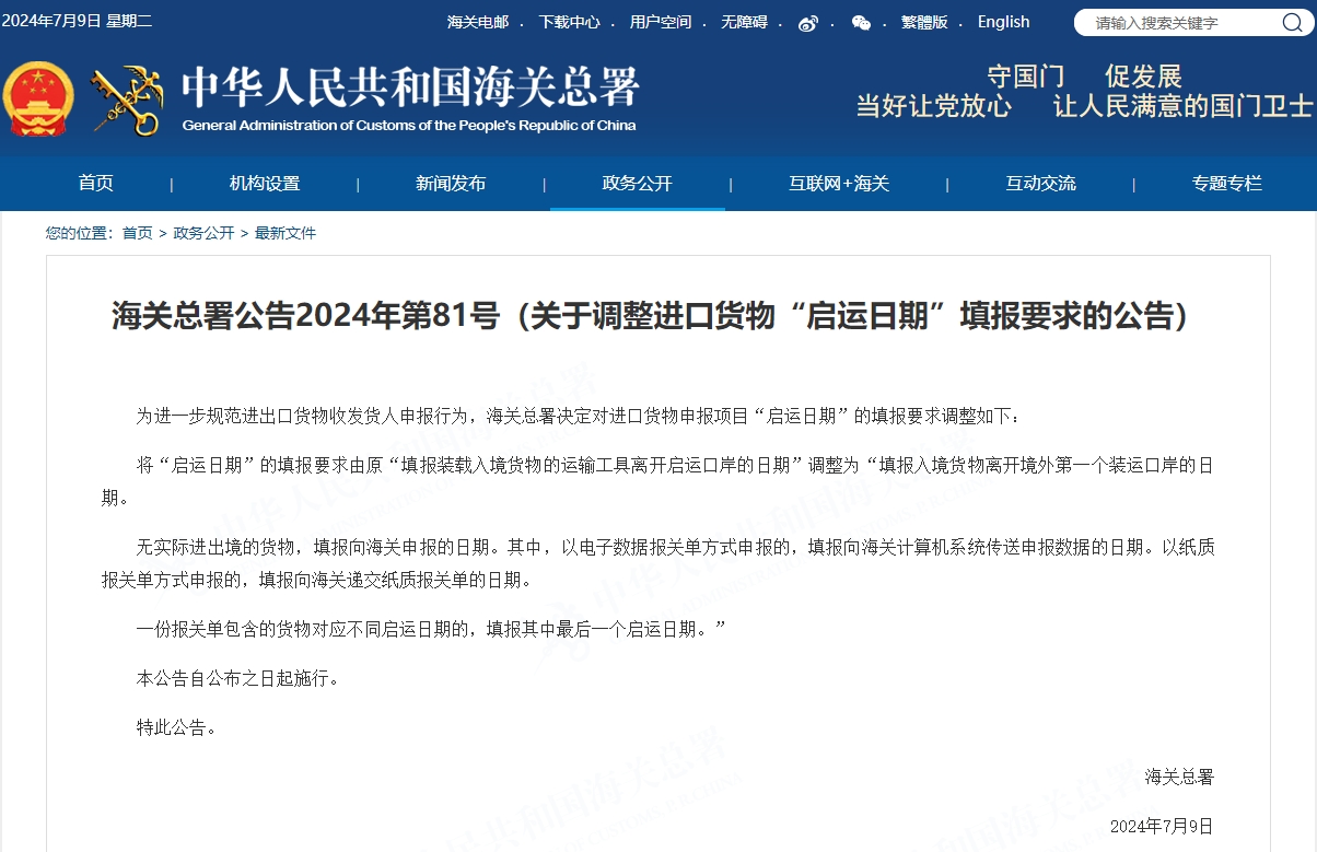 为进一步规范进出口货物收发货人申报行为,海关总署决定对进口货物申报项目“启运日期”的填报要求调整如下: