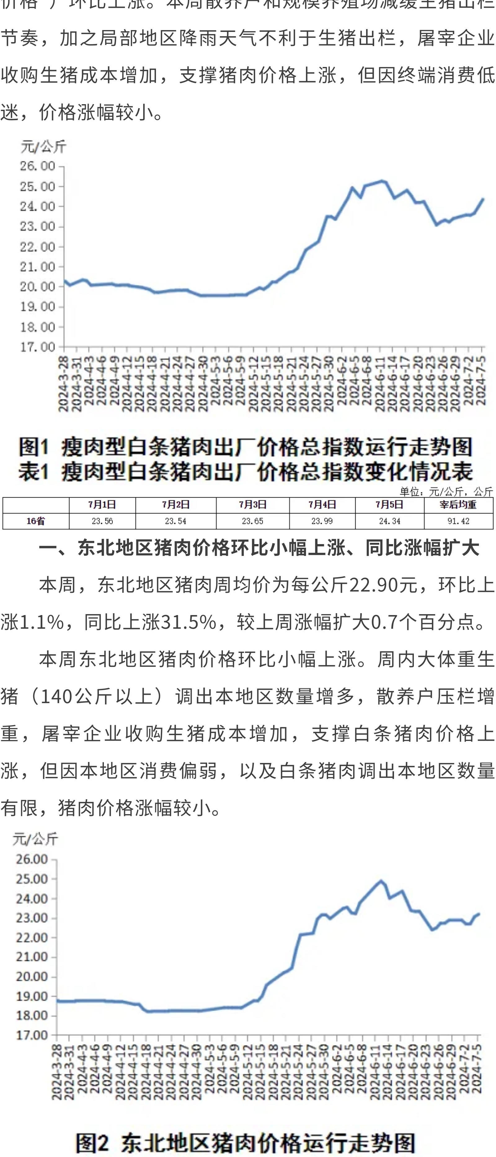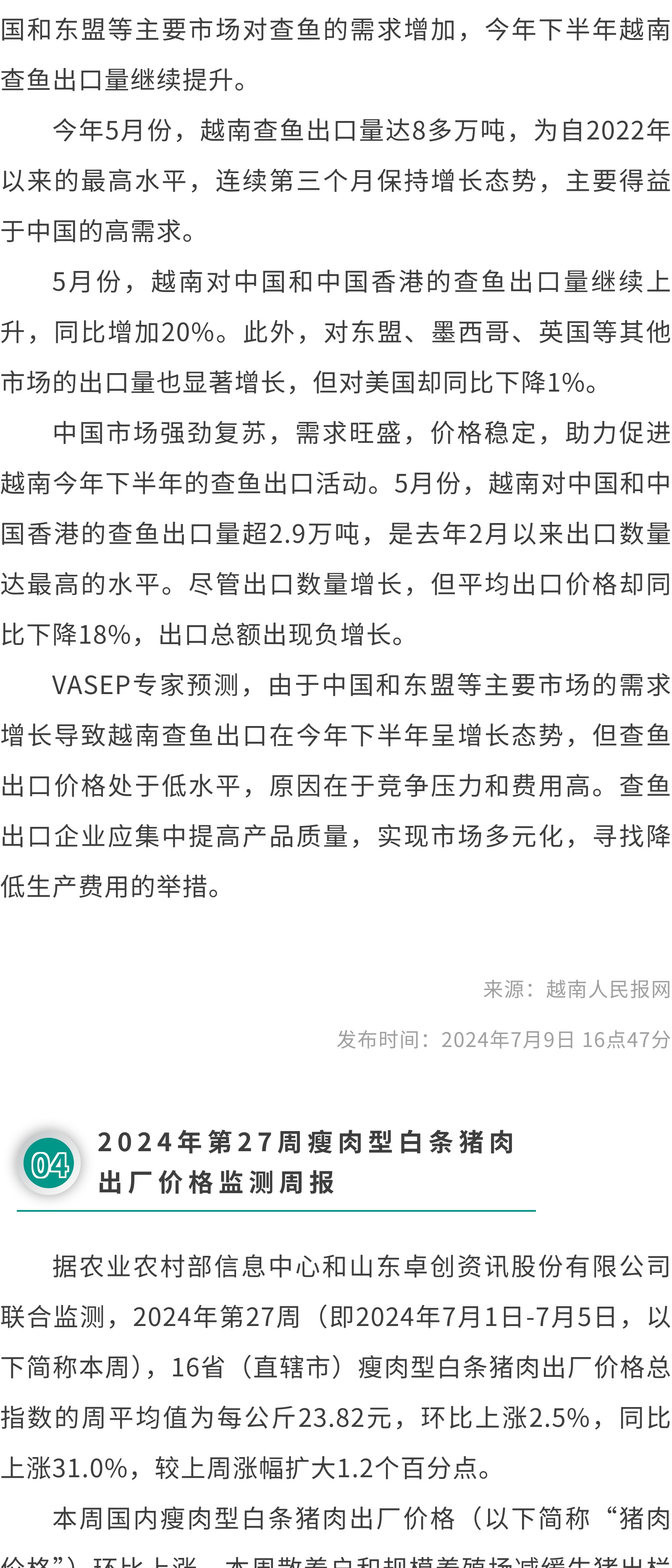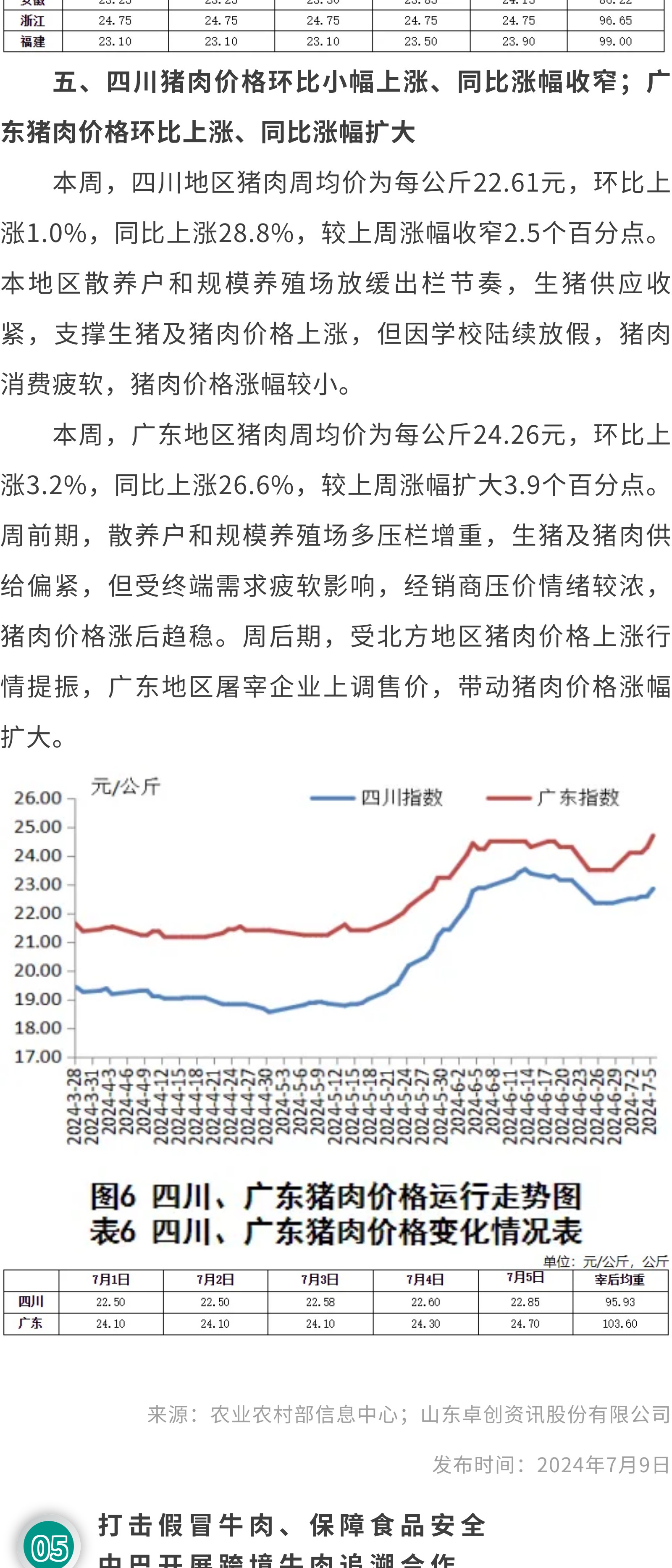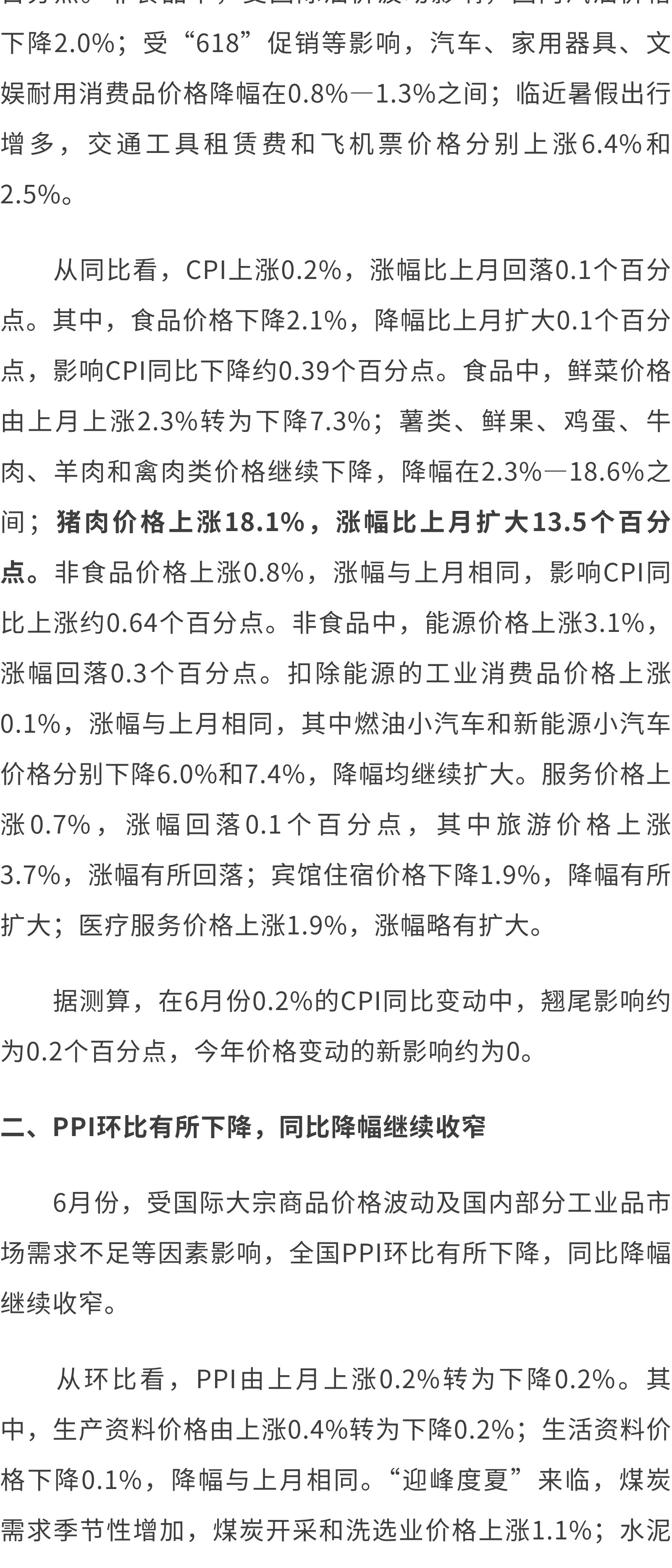 ①国家统计局:2024年6月份CPI环比下降0.2%②7月生猪出栏计划环比增加生猪出栏节奏或加快③2024年第27周瘦肉型白条猪肉出厂价格监测周报④打击假冒牛肉、保障食品安全,中巴开展跨境牛肉追溯合作