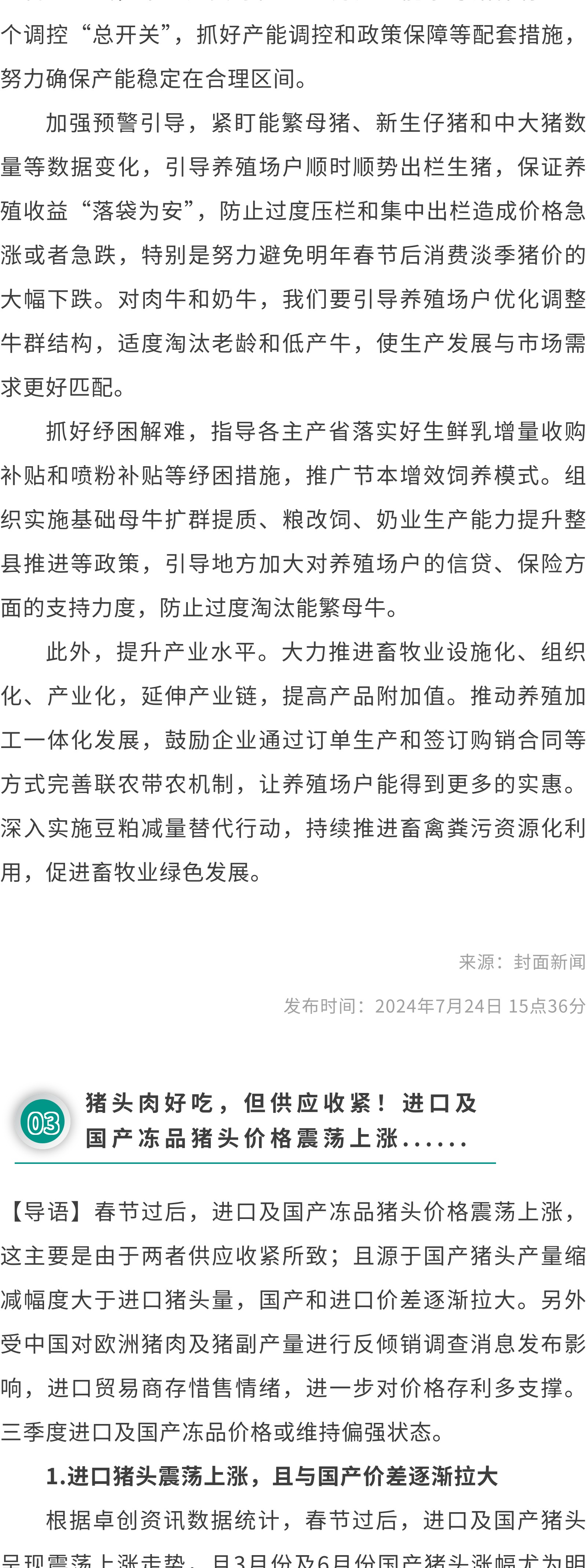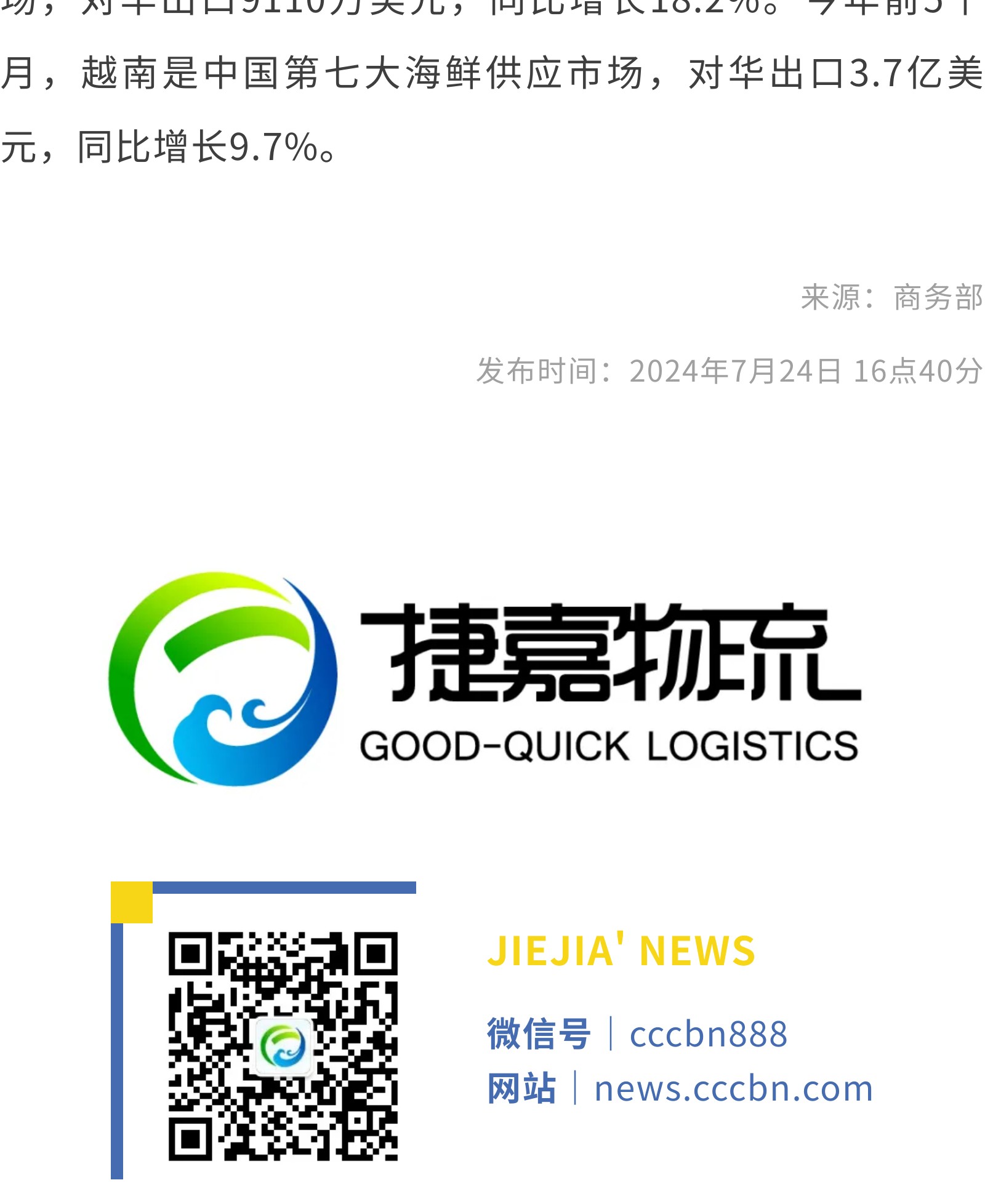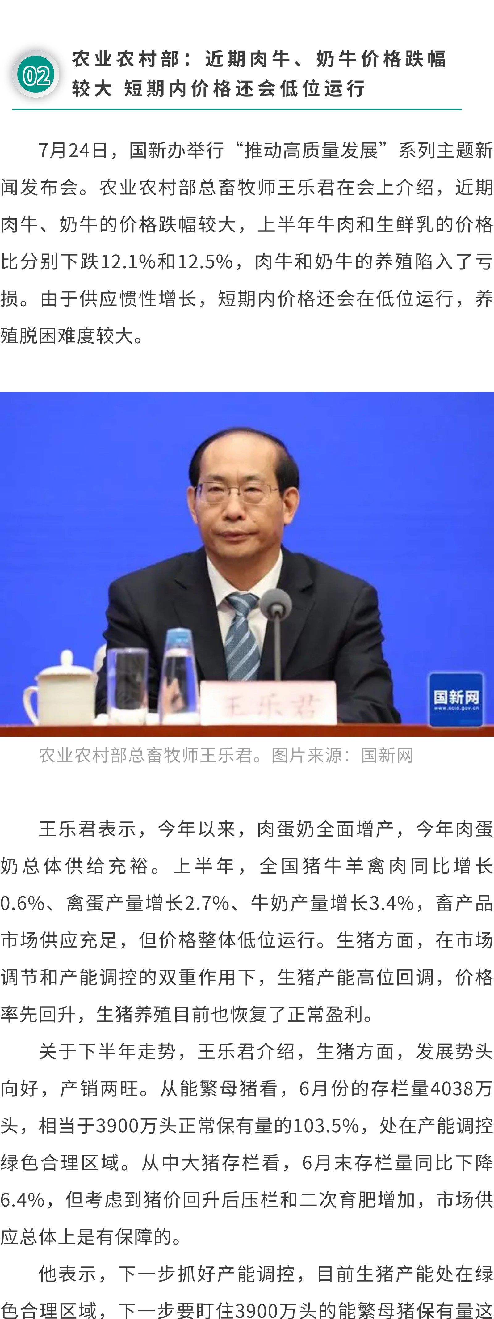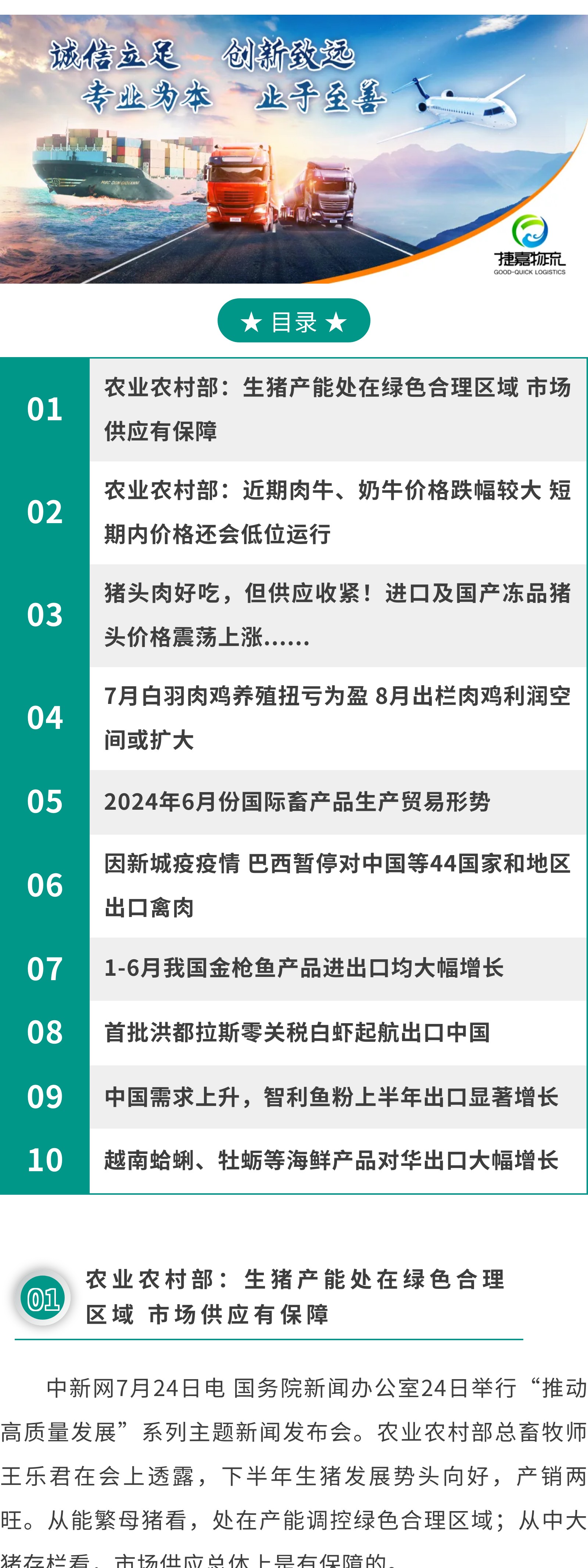 捷嘉 ·关注 | ①农业农村部:生猪产能处在绿色合理区域 市场供应有保障②近期肉牛、奶牛价格跌幅较大 短期内价格还会低位运行③1-6月我国金枪鱼产品进出口均大幅增长④首批洪都拉斯零关税白虾起航出口中国