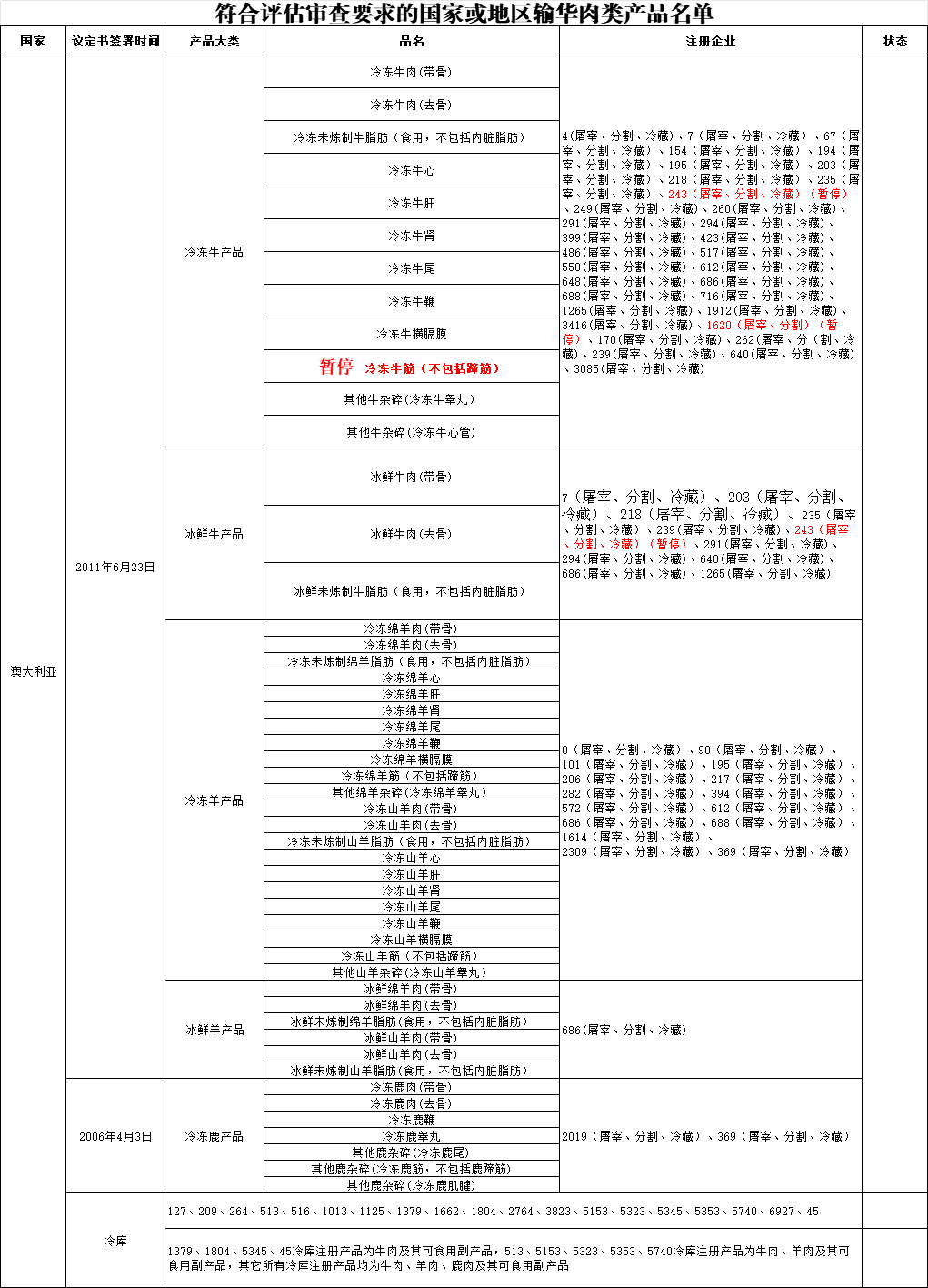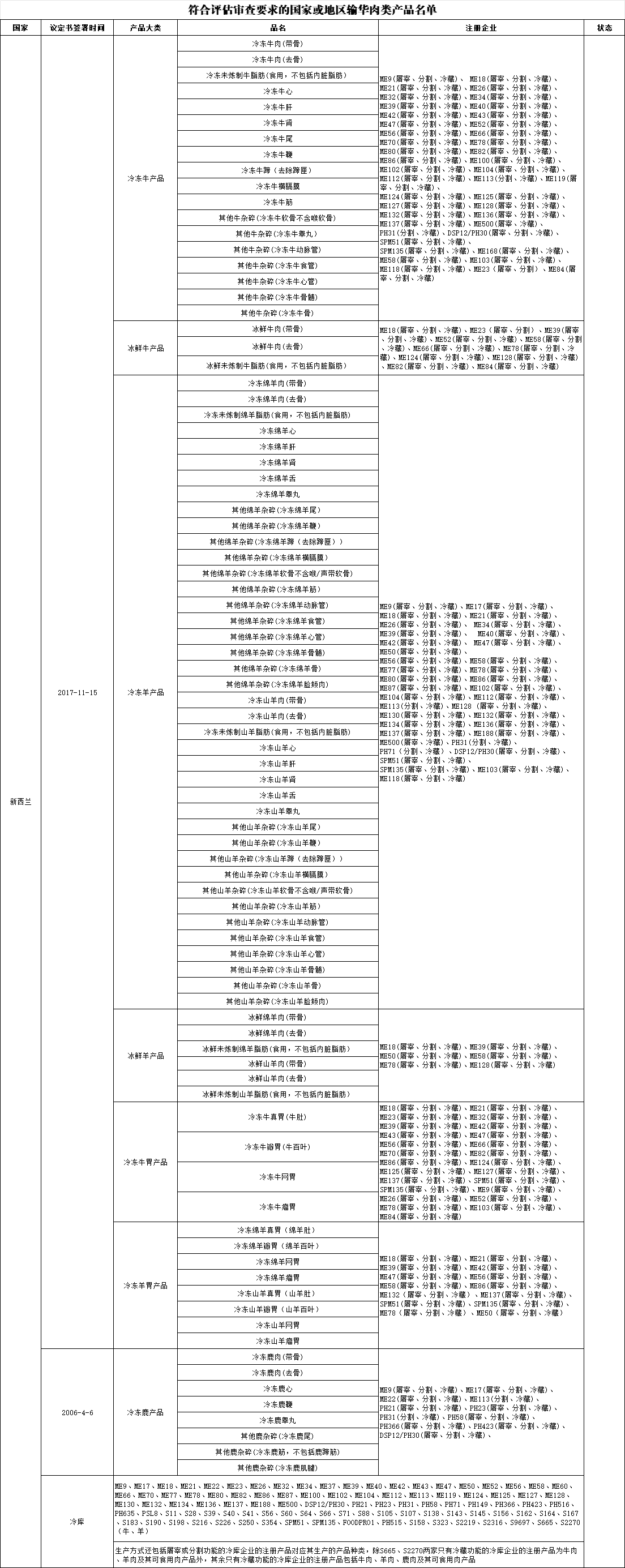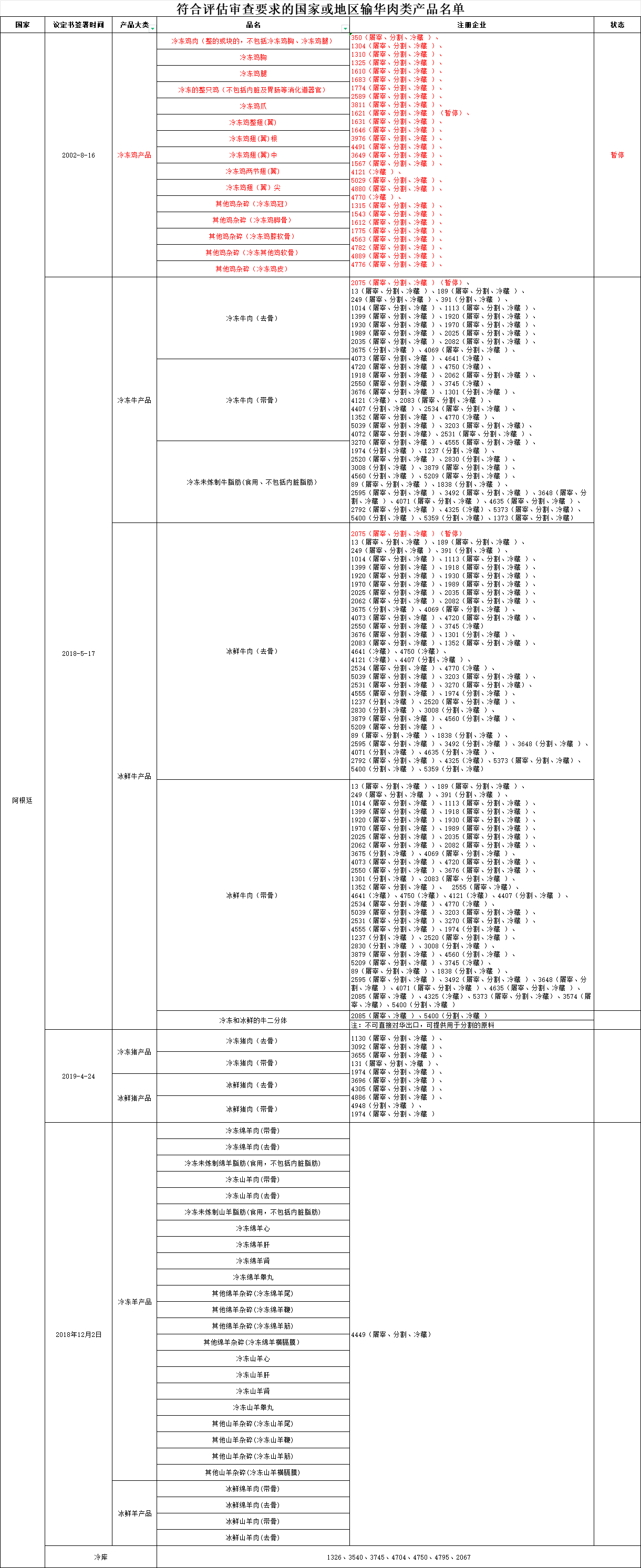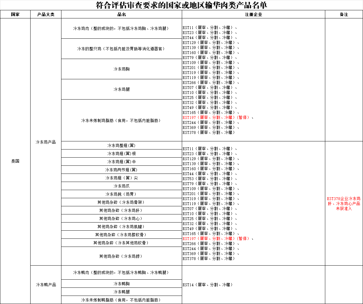 近日,海关总署更新《符合评估审查要求的国家或地区输华肉类产品名单》: