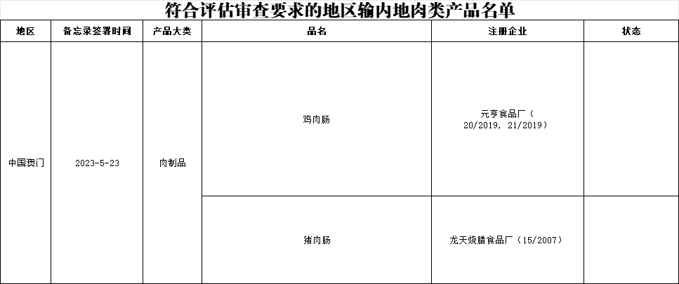 新增中国澳门1家肉类工厂进口: