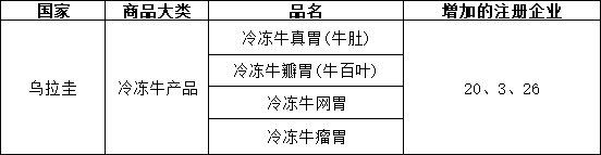 如下图,新增乌拉圭3个冷冻牛产品企业输华: