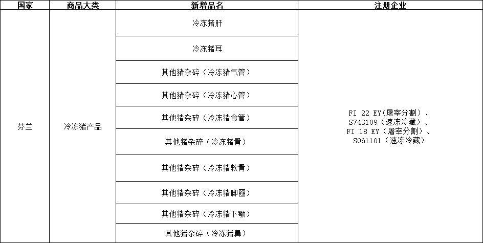 如下图,新增了芬兰冷冻猪产品的部分输华品类: