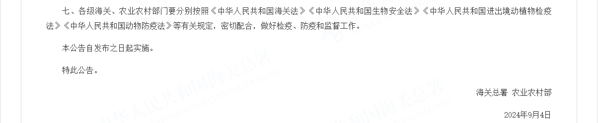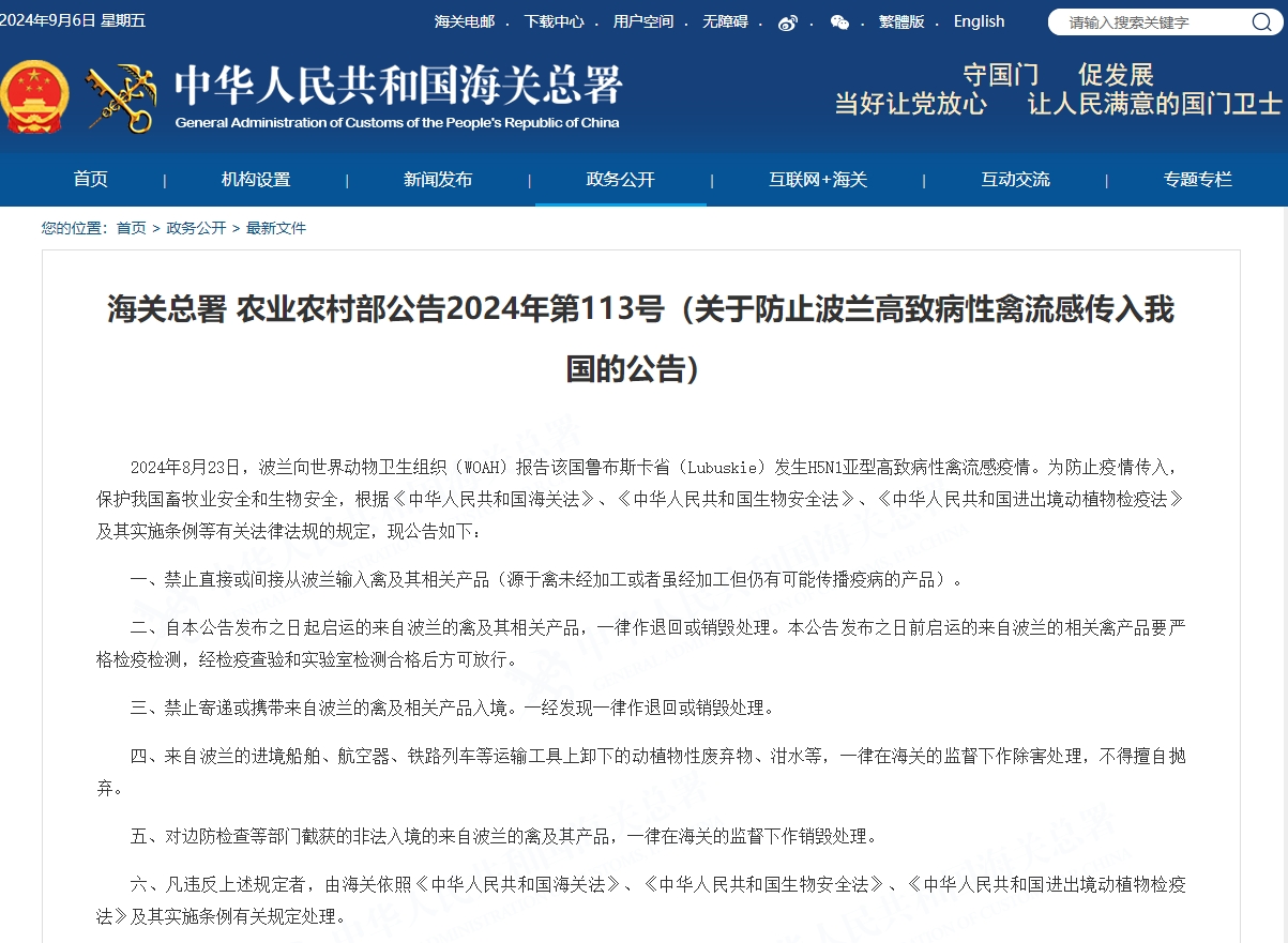 01 | 海关总署 农业农村部公告2024年第113号(关于防止波兰高致病性禽流感传入我国的公告) |