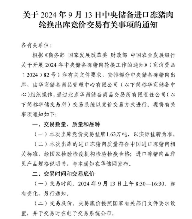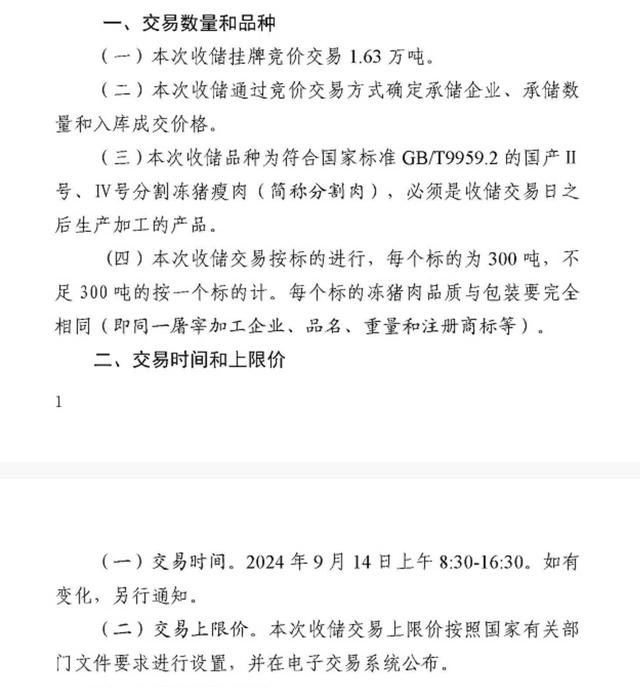 当天,华储网还发布关于2024年9月14日中央储备冻猪肉轮换收储竞价交易有关事项的通知。本次收储挂牌竞价交易1.63万吨。