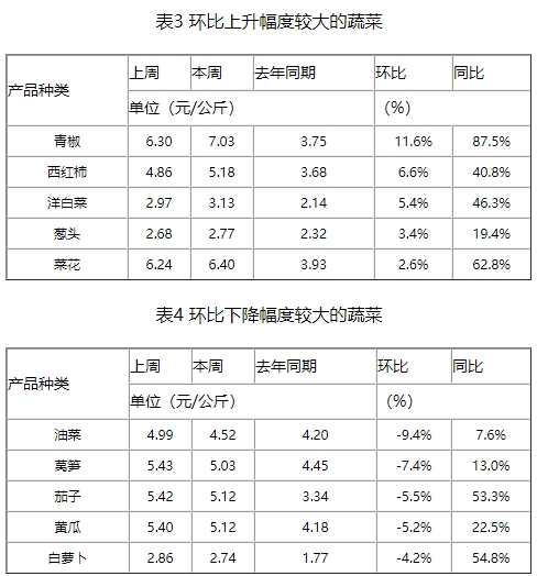 监测的19种蔬菜价格中,本周青椒、西红柿、洋白菜、葱头和菜花的价格环比涨幅较大,幅度分别为11.6%、6.6%、5.4%、3.4%和2.6%(如表3所示);油菜、莴笋、茄子、黄瓜和白萝卜的价格环比降幅较大,幅度为9.4%、7.4%、5.5%、5.2%和4.2%(如表4所示)。