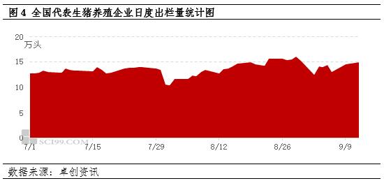 9月份卓创资讯监测样本企业生猪出栏计划环比增幅7.44%,增幅达到6月份以来的最高水平。8月份养殖规模养殖企业生猪出栏计划完成速度减慢,且因8月份猪价涨至高点后,二次育肥补栏积极性减弱,规模养殖企业110-120公斤生猪销售量减少,9月份可出栏适重猪源存栏增加,导致9月份生猪出栏计划环比继续增加。