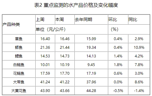 本周,重点监测的水产品草鱼、鲫鱼、鲤鱼、白鲢鱼、花鲢鱼、大带鱼和大黄花鱼与上周相比,变化幅度在-0.5~1.8%之间(如表2所示)。