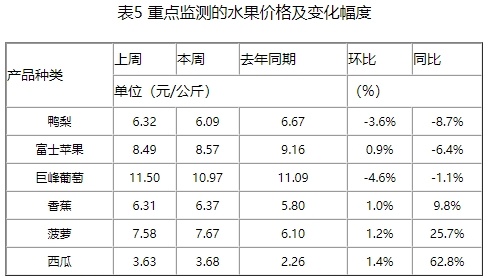 本周重点监测的6种水果平均价格为7.23元/公斤,比上周下降1.1%,同比上升5.5%(如表5所示)。