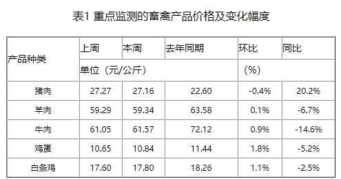 本周重点监测的畜禽产品猪肉、羊肉、牛肉、鸡蛋和白条鸡与上周相比,变化幅度在-0.4~1.8%之间(如表1所示)。