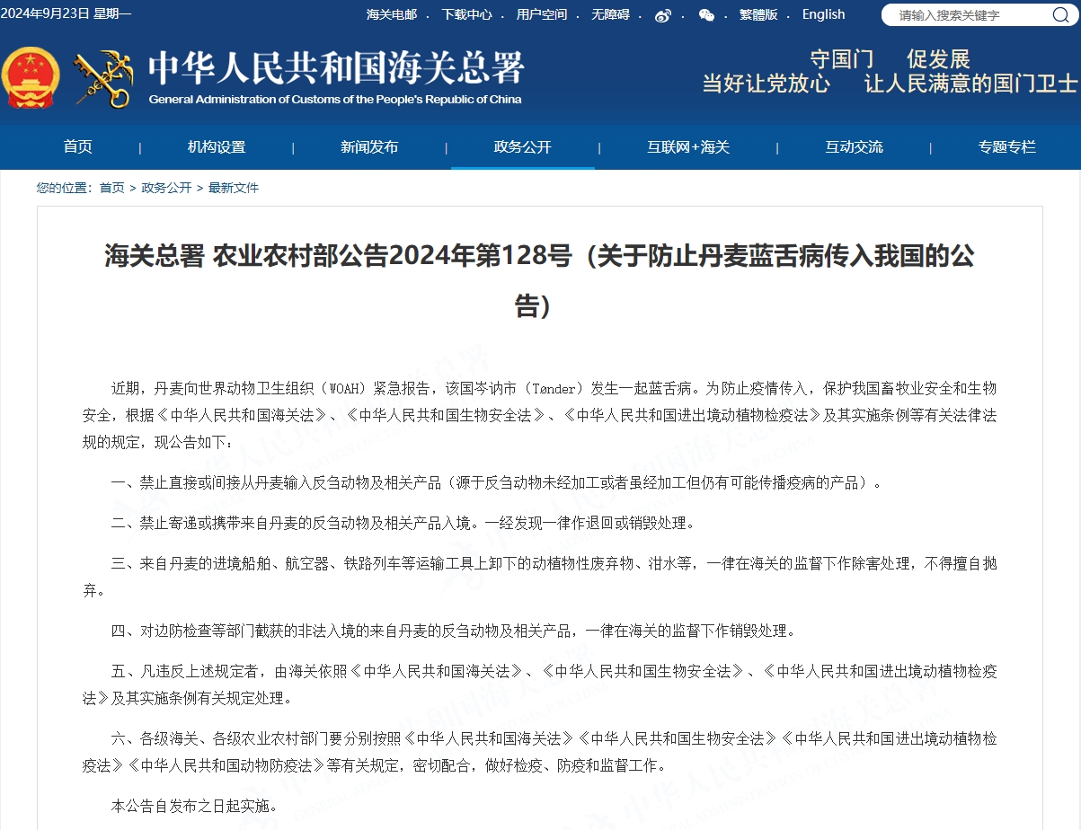 02 | 海关总署 农业农村部公告2024年第128号(关于防止丹麦蓝舌病传入我国的公告) |