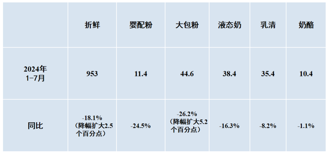 1-7月乳制品进数量及同比变化(单位:万吨)