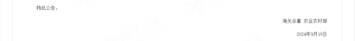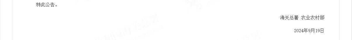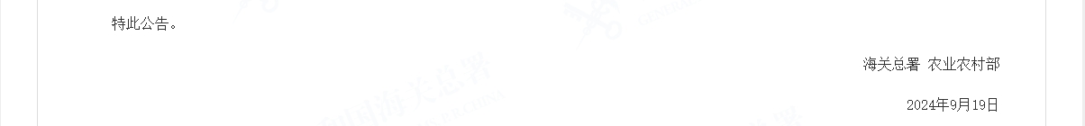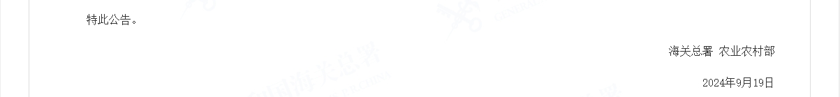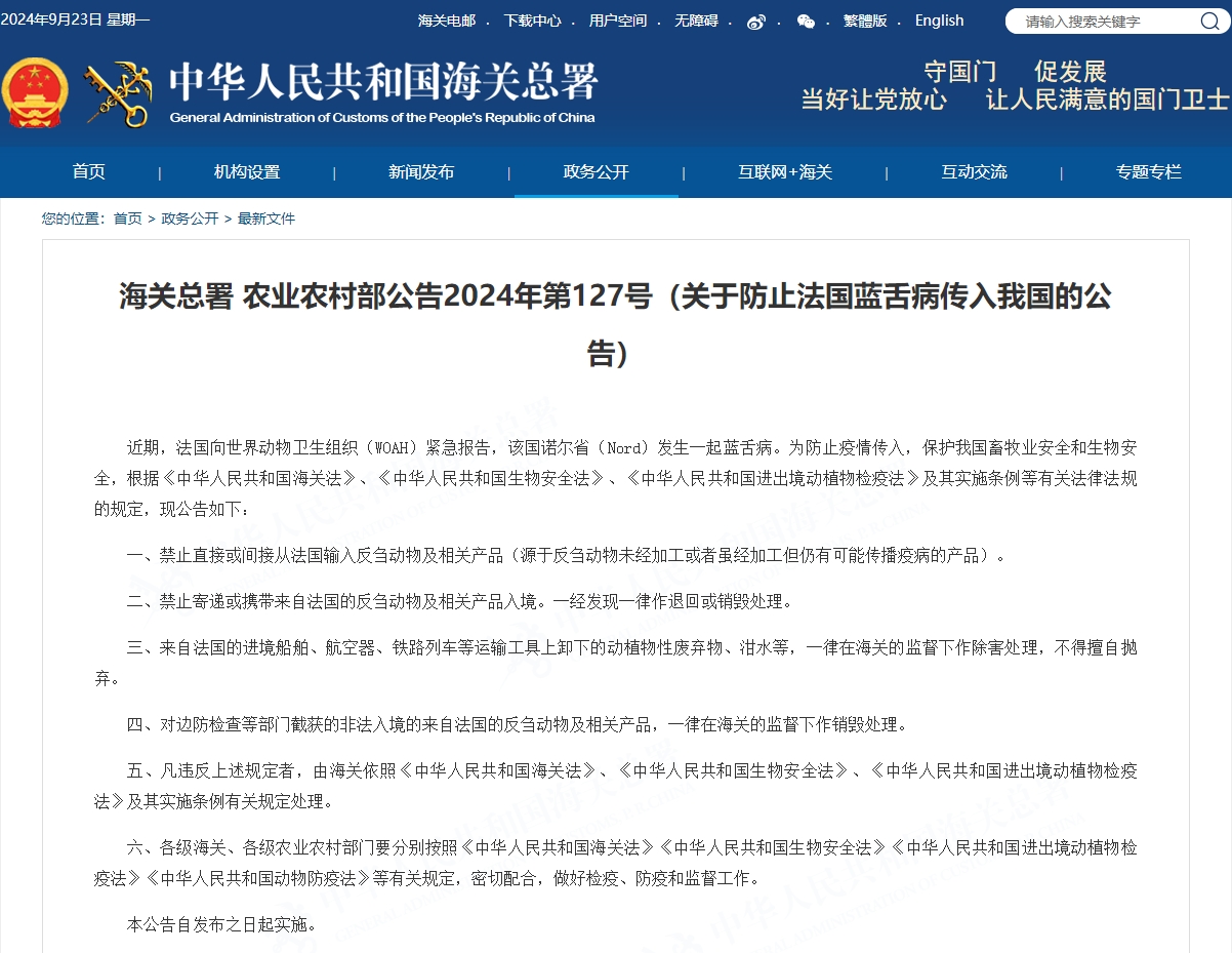 01 | 海关总署 农业农村部公告2024年第127号(关于防止法国蓝舌病传入我国的公告) |
