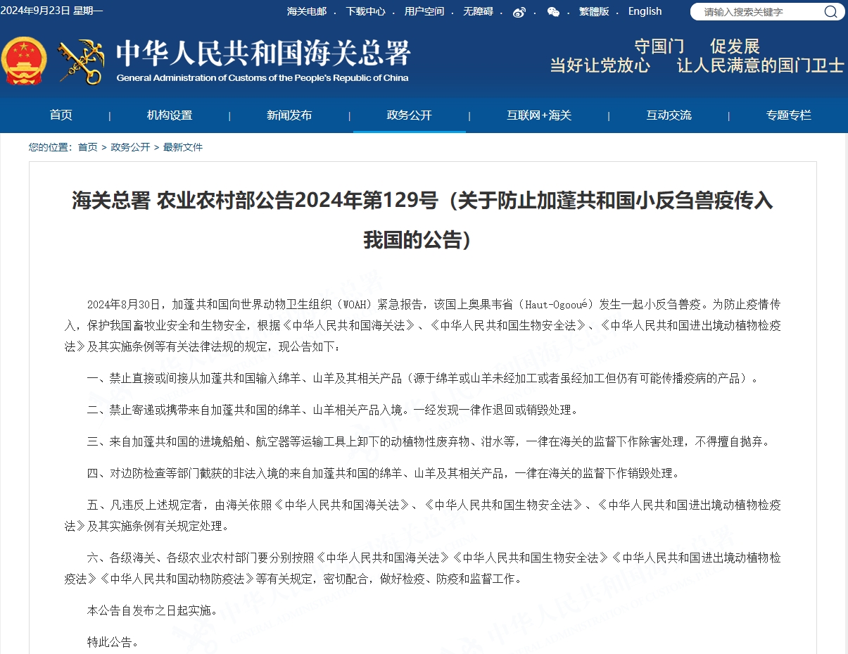 03 | 海关总署 农业农村部公告2024年第129号(关于防止加蓬共和国小反刍兽疫传入我国的公告) |