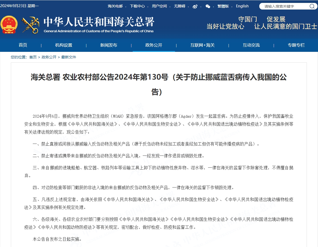 2024年9月6日,挪威向世界动物卫生组织(WOAH)紧急报告,该国阿格德尔郡(Agder)发生一起蓝舌病。为防止疫情传入,保护我国畜牧业安全和生物安全,根据《中华人民共和国海关法》、《中华人民共和国生物安全法》、《中华人民共和国进出境动植物检疫法》及其实施条例等有关法律法规的规定,现公告如下: