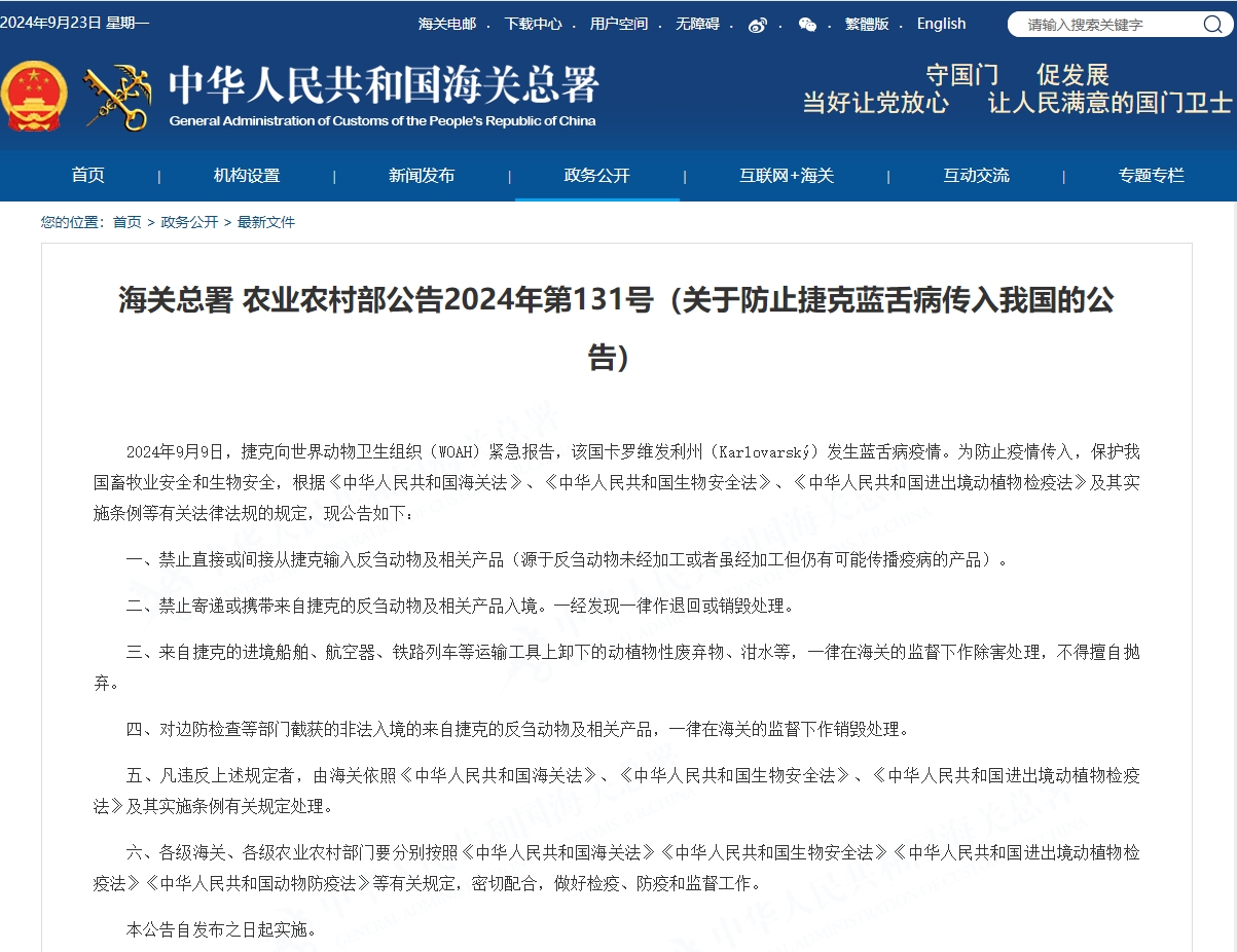 05 | 海关总署 农业农村部公告2024年第131号(关于防止捷克蓝舌病传入我国的公告) |