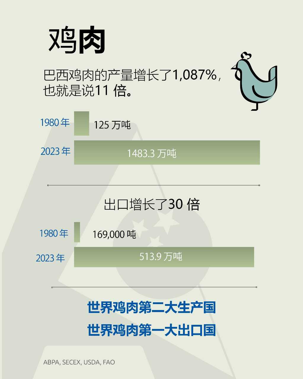 生产粮食是巴西的天赋。大量的自然资源和农产品供应、构筑了一体化的生产系统;同时良好的卫生状况进一步提高了生产力和巴西鸡肉行业的在全球的竞争力。自1980 年至 2023 年间,巴西鸡肉产量增长了 1,087% 以上,成为世界第二大鸡肉生产国;同时出口增长30多倍,成为世界第一大鸡肉出口国。