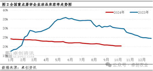 本月冻品库存率持续走低。整体看,月内的冻品需求一般,屠宰企业的出库速度较缓,华东部分屠宰企业的被动入库量较大,拉动冻品库容率的下降幅度收窄;同时,中秋节前的冻品消费受原料价格影响,有所提振,但幅度较为有限。所以本月的冻品库容率仍小幅下滑。10月整体行情或亦受鲜品价格波动影响,被动入库现象仍存,冻品库容率或仍有以下跌为主。