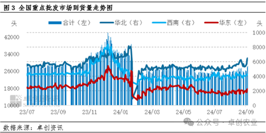 本月国内重点批发市场到货量呈“倒N”型的走势。根据卓创资讯数据监测,截至9月27日,全国重点批发市场日均到货量2.84万头,为月内最高,环比上涨8.40%,但是价格却长期倒挂。月内有中秋及国庆两次节日提振,部分市场存小幅备货行为,整体销量亦有所增加。但中秋节后需求惯性回落,终端商户拿货积极性一般,且整体供应较为充足,商户有等价、压价心理,批发市场成交情况较为疲软;且个别地区受雨水天气影响,批发市场人流量下降,活跃度减弱。