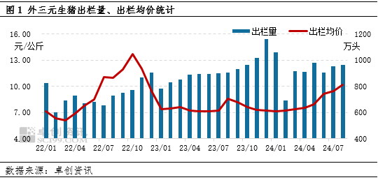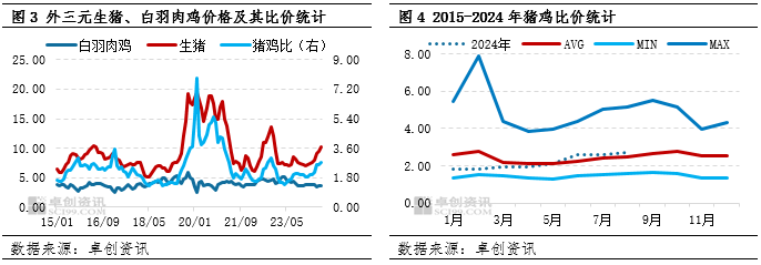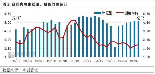 2022年国内出现猪鸡共振上涨的现象,根本原因是供应量减少。2023年白羽肉鸡出栏量同比增加,市场价格应声下跌,年内月均价最大跌幅29.78%。2024年1-8月白羽肉鸡市场整体是量增价减的状态,生猪价格底部反弹也未能产生利多影响。根据繁育、生长周期推断,四季度白羽肉鸡出栏量将缓慢增加,或较难支撑市场价格走高。