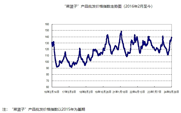 据农业农村部监测,2024年第39周(2024年9月23日—29日,下同)“农产品批发价格200指数”为134.82(以2015年为100),比前一周升1.16个点,同比高14.10个点;“‘菜篮子’产品批发价格指数”为138.21(以2015年为100),比前一周升1.34个点,同比高17.43个点。