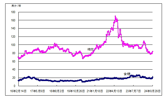 国际糖料理事会原糖周均价每磅22.48美分(每吨496美元),环比涨12%,同比低14%;美国芝加哥商品交易所豆油、大豆、小麦和玉米最近期货合约收盘周均价每吨分别为953美元、385美元、214美元和163美元,环比分别涨5%、4%、2%和1%,同比分别低26%、低19%、高1%和低14%;马来西亚棕榈油荷兰鹿特丹港到岸周均价每吨1212美元,环比涨5%,同比高29%;国际棉花价格指数(SM级)每磅83.59美分(每吨1843美元),环比涨2%,同比低17%。