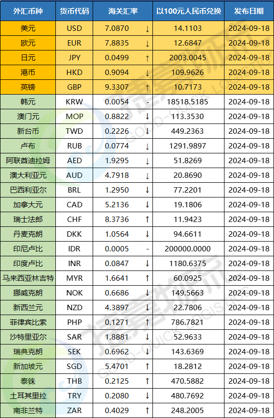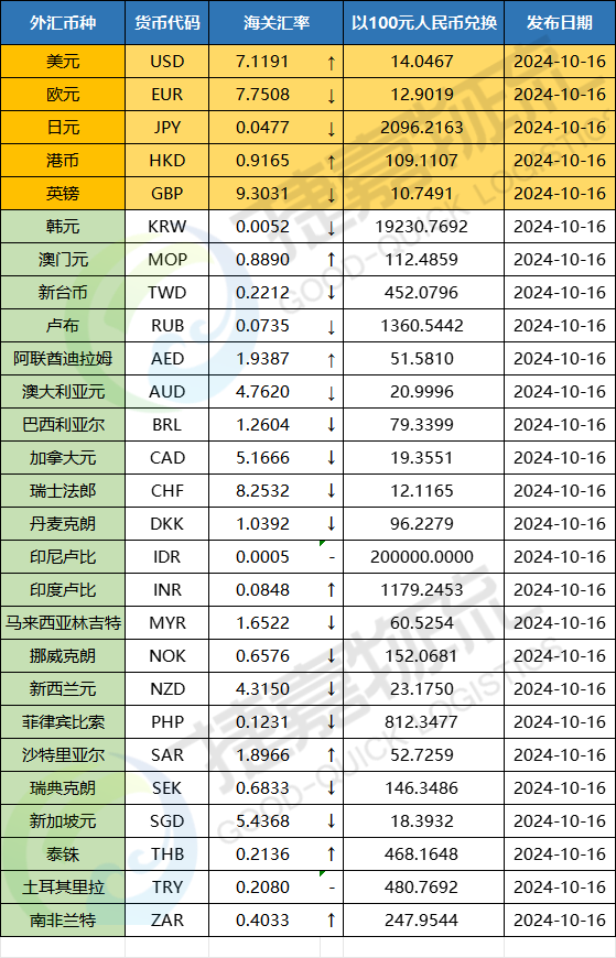 2024年11月海关适用汇率